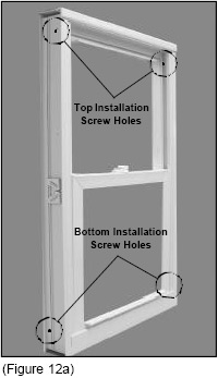 Install and tighten installation screws in the screw holes described above. Do not over tighten as this may distort/bow the frame. (See Figure 13) Replace the top and bottom sash stops at this time.